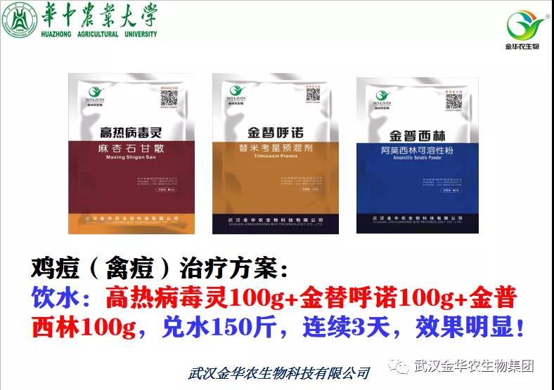 高熱病毒靈100g+金替呼諾100g+金普西林100g,兌水150斤,連續3天,效果明顯!