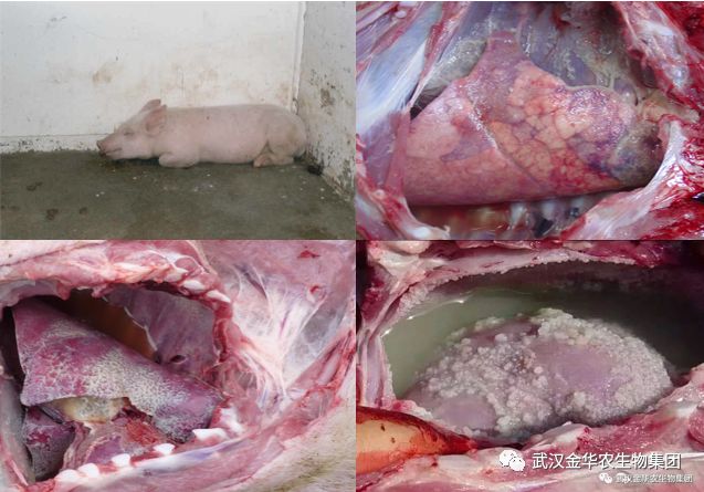 1、最急性型:感染開始時,一個或幾個豬群中1頭或幾頭豬突然發病,并可在無臨床癥狀情況下突然死亡,隨后疾病在敏感豬中傳播很快。病豬體溫高達41.5℃,精神委頓、不愿活動,厭食或廢食,并能出現短期腹瀉或嘔吐。
