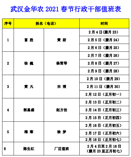 武漢金華農關于春節值班的相關安排