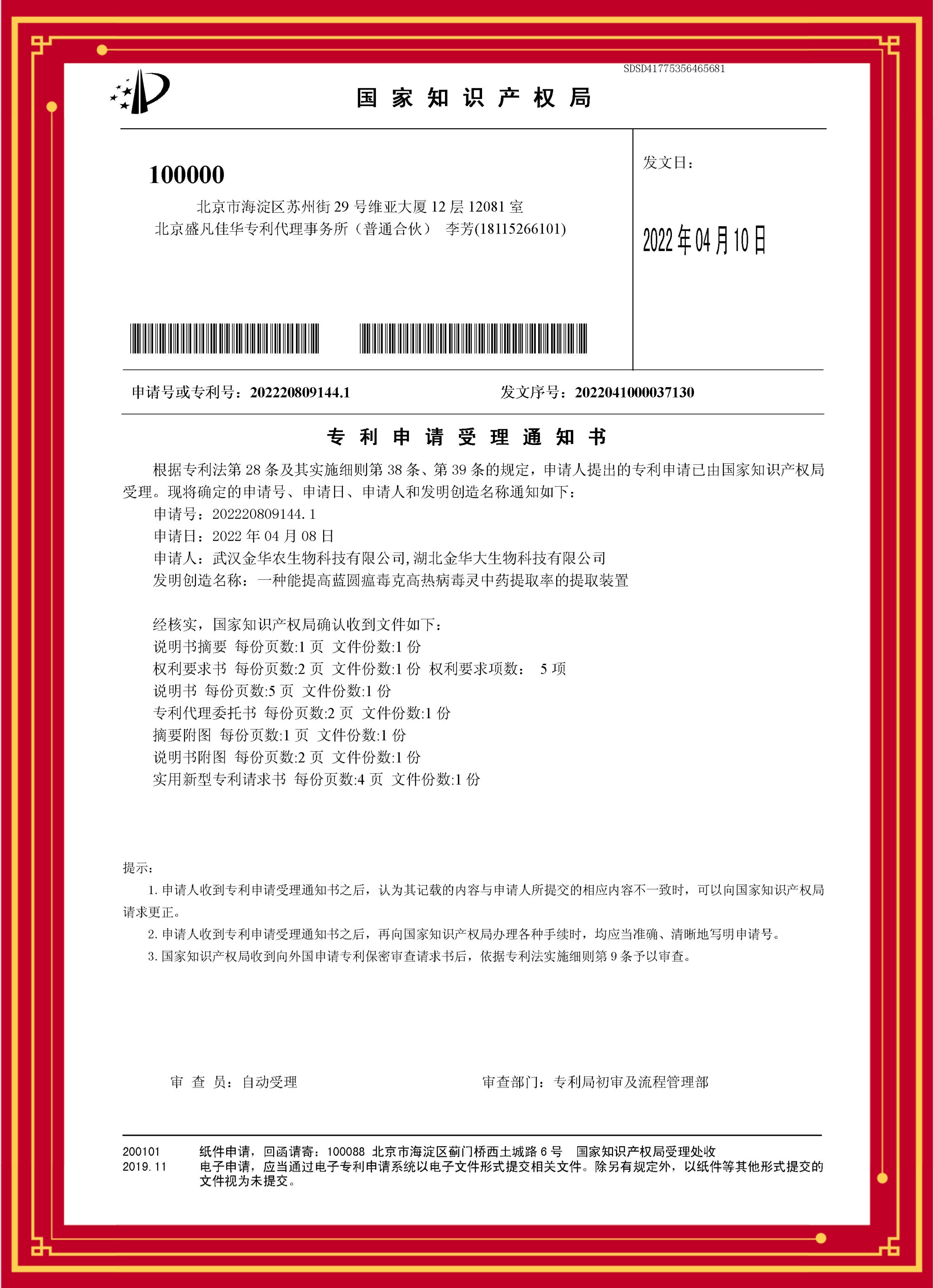 科技發(fā)明專利(高熱病毒靈):專利號—202220809144.1