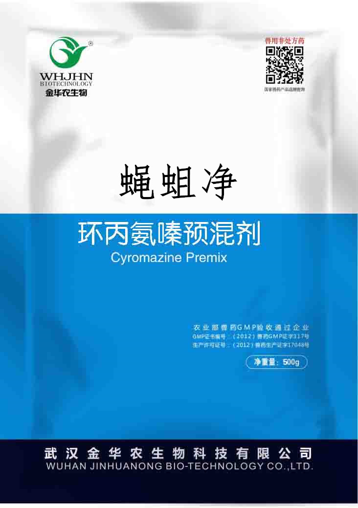 環丙氨嗪屬于殺蟲藥,可抑制雙翅目幼蟲的蛻皮,特別是幼蟲第1期蛻皮,使蠅蛆繁殖受阻,也可使蠅蚴不能蛻皮而死亡。雞內服給藥,即使在糞便中含藥量極低也可徹底殺滅蠅蛆,當飼料中濃度達1mg/kg時即能控制糞便中多數蠅蛆的發育,5mg/kg時足以控制各種蠅蛆,一般在用藥后6~24小時發揮藥效,作用可持續1~3周。