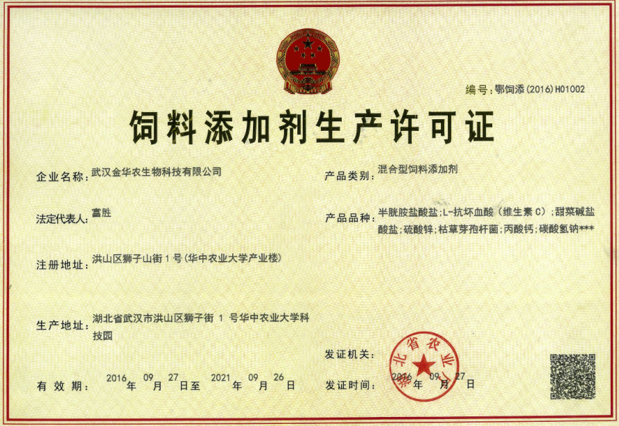 武漢金華農生物喜獲“新一代”飼料添加劑生產許可證