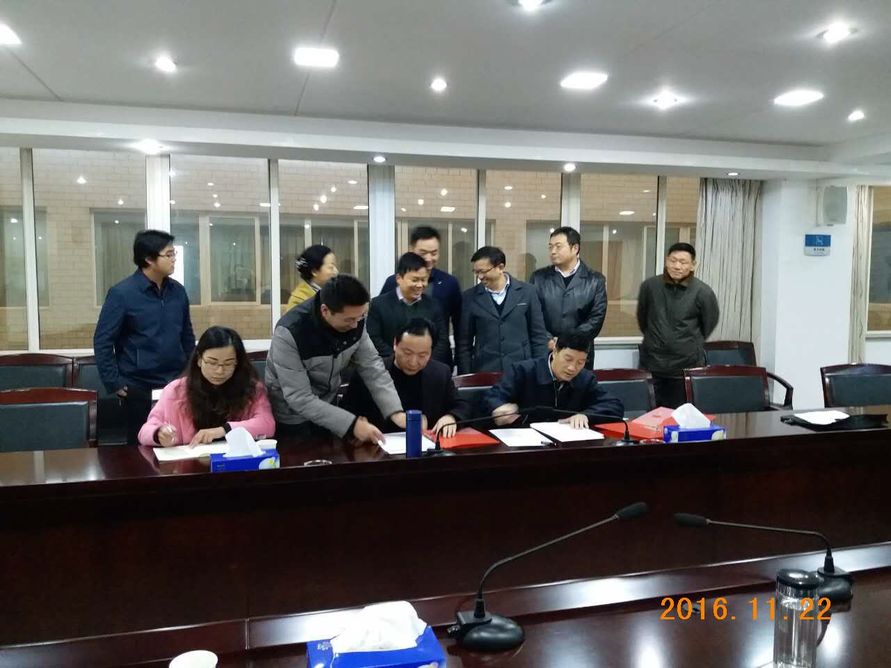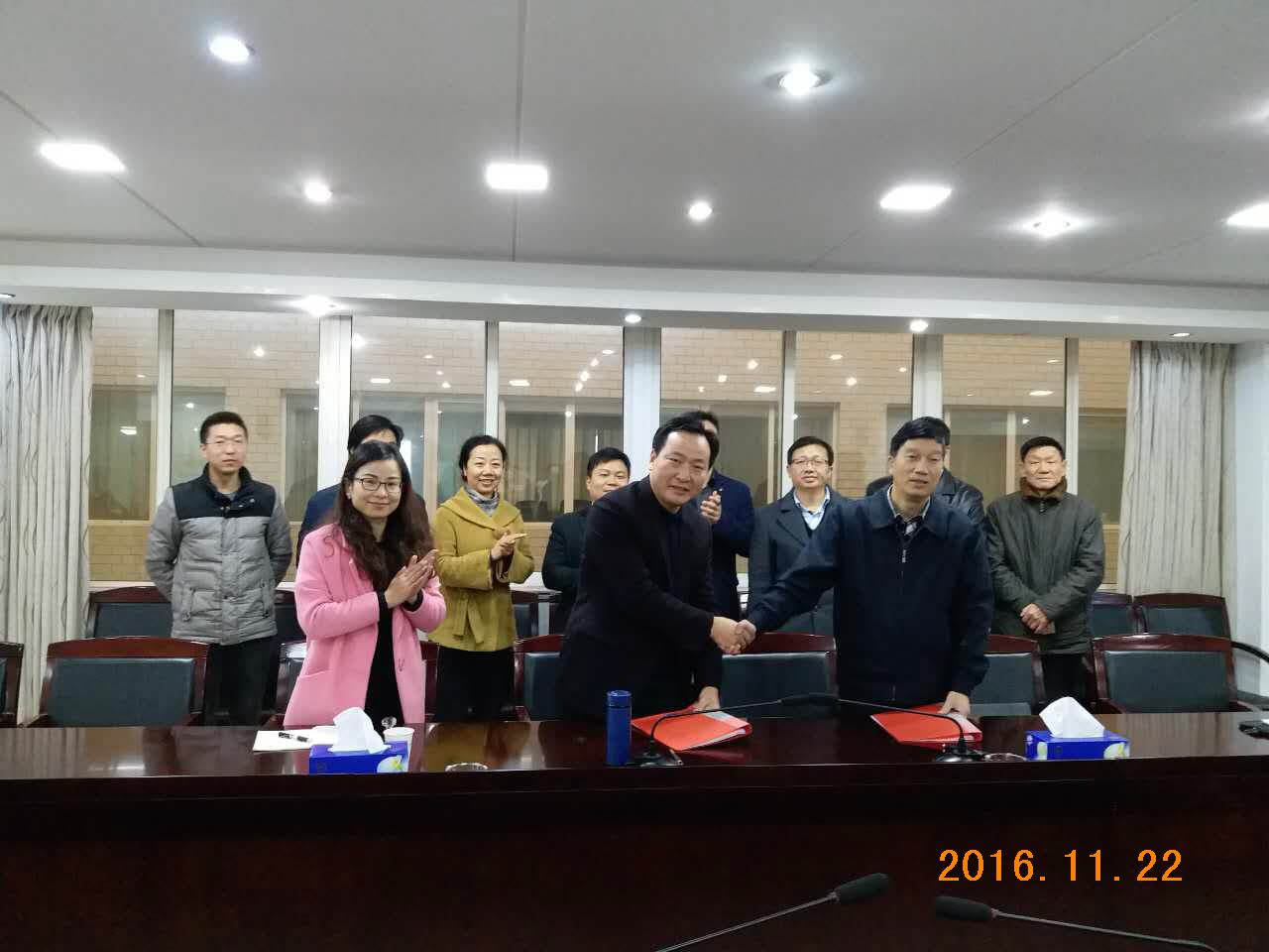 黃開如書記與富勝總裁親切握手,相互友好交換簽約文件