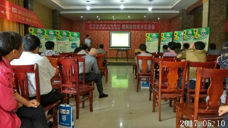 圖片說明:隨著高溫夏季的到來,各種熱應激、濕熱性環境變化,豬只容易免疫力下降而誘發各種疾病發生。為有效應對疾病隱患,幫助廣大養殖戶提高夏季經濟效益,5月10日,武漢金華農生物在天門市多寶鎮開展夏季常見病解析宣傳會議,公司湖北大區劉總、姚老師、顏老師,圍繞“藍耳、豬鏈球菌、豬弓形體、附紅細胞體病、豬皮炎腎病綜合征”五大夏季多發病與當地50多家規模化養殖場進行了解析交流,公司優質組方及綜合防控方案得到新老客戶的一致稱贊。