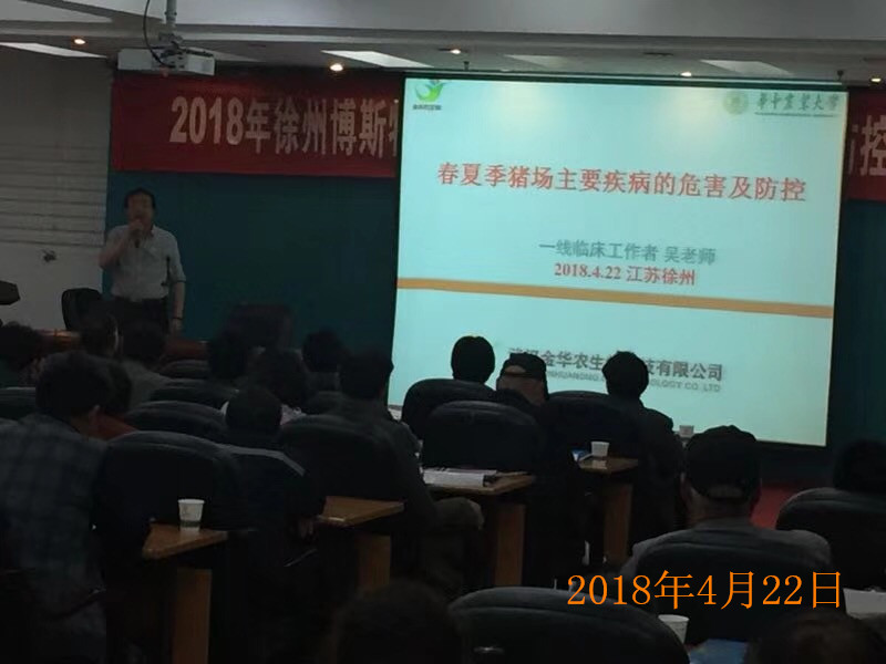 武漢金華農生物2018年春季豬病防控研討會于4月22日在江蘇徐州成功舉辦,會議舉辦非常成功,取得巨大勝利!公司藥品受到與會養豬戶的一致認可與高度贊美!本次會議由公司戰略合作伙伴“徐州博斯特動物疾病防治研究所”畢總、張老師及其團隊具體負責宣傳、策劃、與組織。