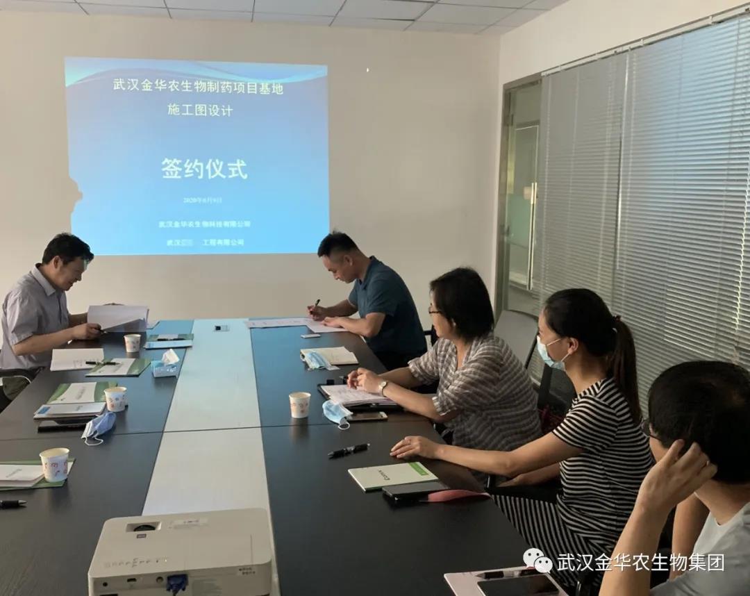 6月9日,武漢金華農生物制藥投資3億元新項目基地施工設計簽約儀式在光谷生物城舉行。公司項目總監黃凡、企劃部經理趙方佳、合作方首席設計師團隊共同出席此次簽約儀式。
